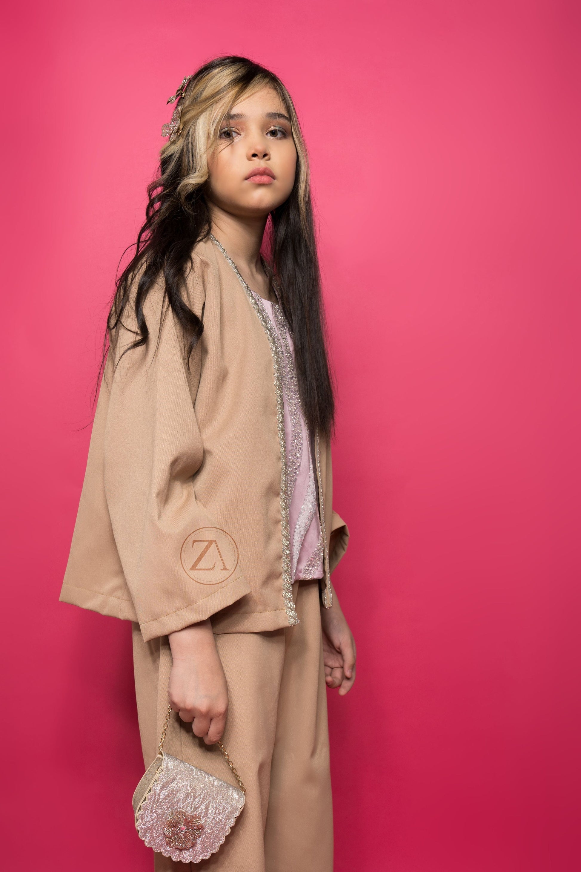 This elegant three-piece set features a sleeveless blush pink top adorned with shimmering sequin wave patterns, paired with wide-leg beige trousers for a sleek and modest silhouette. The matching beige open jacket is delicately finished with sequin-trimmed edges, adding a soft touch of sophistication and balance to the look.